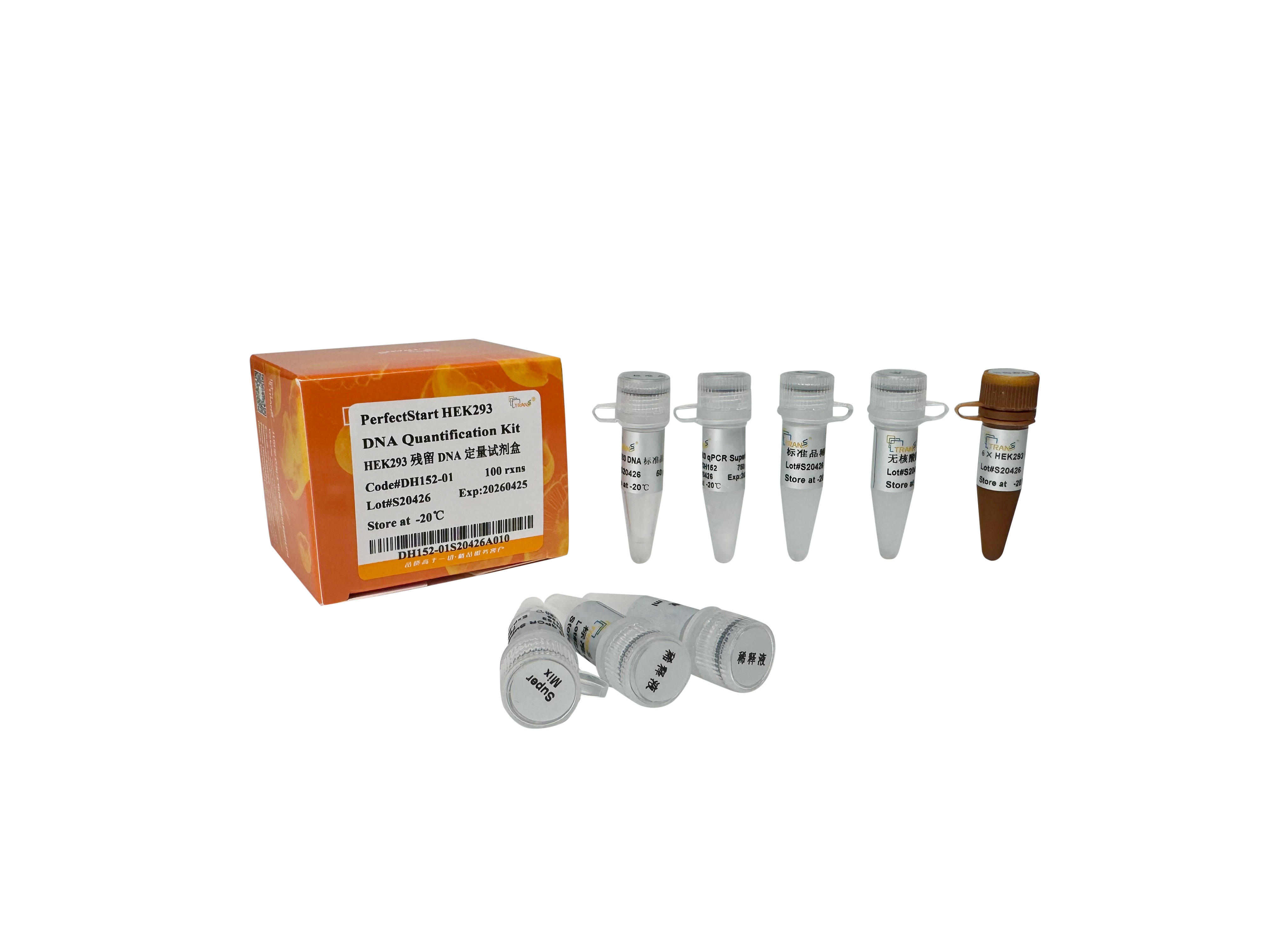 This product is designed for the quantitative detection of HEK293 cell DNA in various biological products by probe-based qPCR. It can be used together with magnetic bead-based host cell residual DNA extraction kit (Cat. No.: EH201). The 2×HEK293 qPCR SuperMix included in this product contains PerfectStart Taq hot start enzyme (which utilizes three monoclonal antibodies to efficiently bind with Taq DNA polymerase, effectively blocking the enzyme's activity and preventing non-specific amplification at low temperature), a specially optimized qPCR reaction buffer for HEK293 cell DNA detection, dNTPs, PCR enhancer, and stabilizer. In addition, a dUTP/UDG system is introduced into this reaction mix, which can degrade U-containing ssDNA and dsDNA before reverse transcription, eliminating carry-over contamination caused by PCR products.
