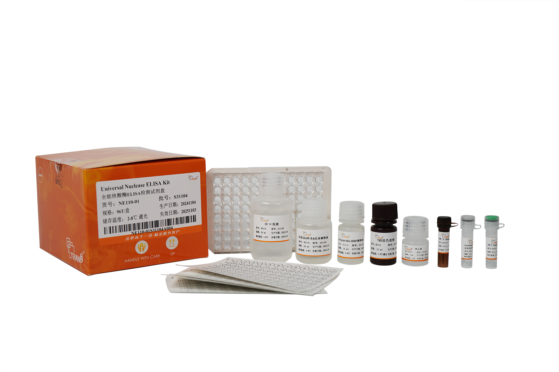This kit employs a sandwich ELISA (Enzyme-Linked Immunosorbent Assay) method for the quantitative determination of Universal Nuclease residues in biological products. The microplate is pre-coated with a high-affinity Universal Nuclease capture antibody. Both standards/samples and a biotin-labeled Universal Nuclease detection antibody are added simultaneously to the wells. During incubation, any Universal Nuclease present in the sample binds specifically to both the immobilized capture antibody on the plate and the biotinylated detection antibody. After a wash step to remove unbound substances, Streptavidin conjugated to Horseradish Peroxidase (Streptavidin-HRP) is added and incubated. The high-affinity, non-covalent interaction between biotin on the detection antibody and streptavidin forms an "capture antibody - Universal Nuclease - detection antibody - Streptavidin-HRP" immune complex. Following another wash, the chromogenic substrate TMB is added to the wells. The HRP enzyme catalyzes the conversion of TMB into a blue product. The intensity of this colorimetric reaction is directly proportional to the concentration of Universal Nuclease in the sample. A stop solution is then added to terminate the reaction, and the absorbance is measured at 450 nm (with a reference wavelength of 570-630 nm). By constructing a standard curve from the absorbance values of the standards, the concentration of Universal Nuclease in the samples can be determined. This kit offers high specificity, superior sensitivity, and a more convenient operational procedure.